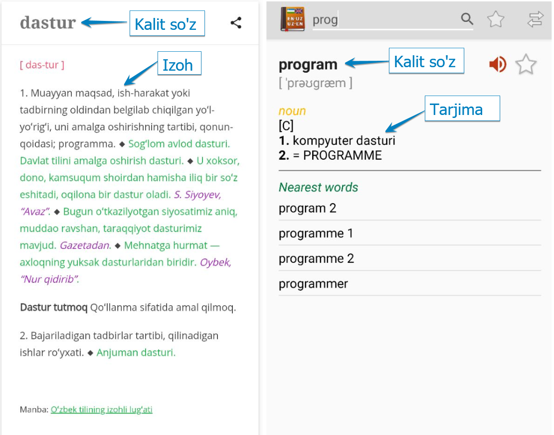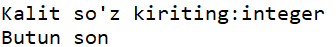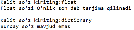 - Foydalanuvchidan biror so'z kiritishni so'rang va so'zning tarjimasini yuqoridagi lug'atdan chiqarib bering. Agar so'z lu'gatda mavjud bo'lmasa, "Bunda so'z mavjud emas" degan xabarni chiqaring.