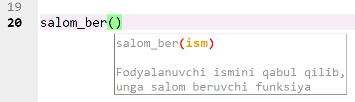Xo'sh, bu ma'lumot qachon va qayerda ko'rsatiladi? Dastur yozish jarayonida funksiya nomini yozishingiz bilan, docstring ko'rsatiladi: