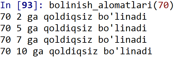 yuchun2standart qiymatini bering. - Foydalanuvchidan son qabul qilib, sonni 2 dan 10 gacha bo'lgan sonlarga qoldiqsiz bo'linishini tekshiruvchi funksiya yozing. Natijalarni konsolga chiqaring.