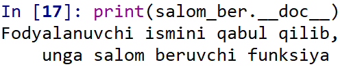 Docstringni konsolga chiqarish uchun print(funksiya_nomi.__doc__) deb ham yozishimiz mumkin: