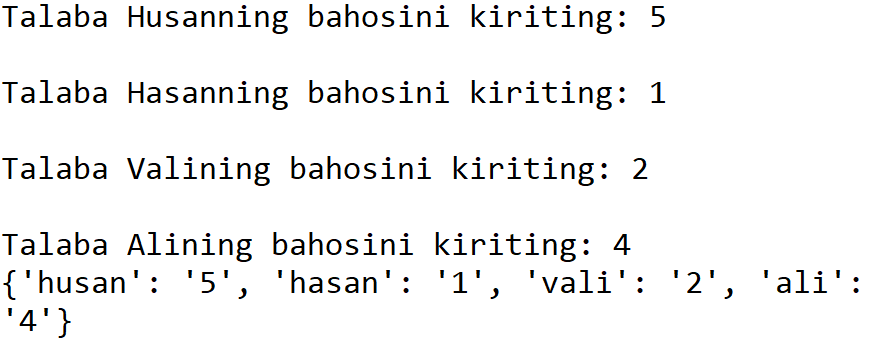 baho = input(f"Talaba {ism.title()}ning bahosini kiriting: ")