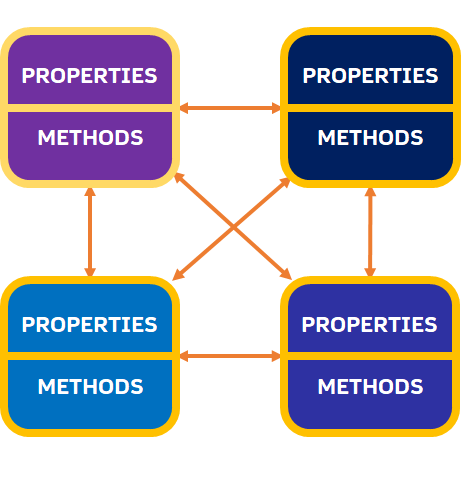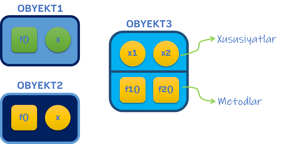 Object oriented dasturlashda o’zaro bo’gliq bo’lgan o’zgaruvchilar va funksiyalar bitta konteynerga jamlanadi va bunday konteynerlar obyekt deb ataladi. Bir obyektga tegishli o’zgaruvchilar uning xususiyatlari, unga tegishli funksiyalar esa metodlari deb ataladi.