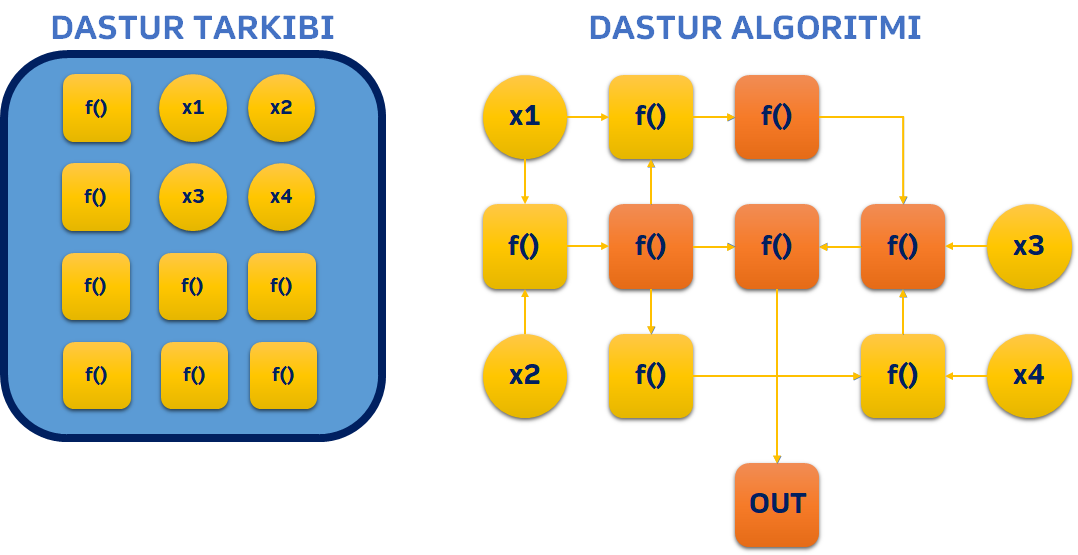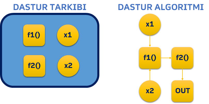 Siz ham dasturlashga ilk qadam qo’yganingizda mana shunday chiziqli dasturlarni yozishni o’rganishdan boshlaysiz. Sizning dasturingiz bir nechta o’zgaruvchilar va funksiyalardan iborat bo’ladi. Bu o’zgaruvchilar va funksiyalar ma’lum ketma-ketlikda bir biri bilan munosabatga kiradi va dastur yakunida siz kutgan natijani beradi.