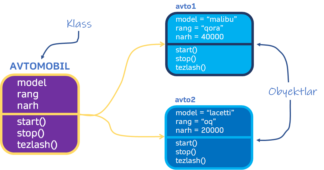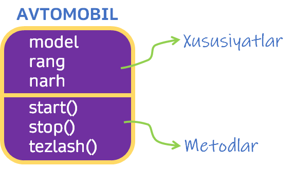 Keling misol tariqasida avtomobil degan obyektni ko’ramiz. Avtomobilning modeli, rangi va narhi uning xususiyatlari. Avtomobilga tegishli bo’lgan start(), stop() va tezlashish() kabi amallar esa uning metodlari deyiladi.