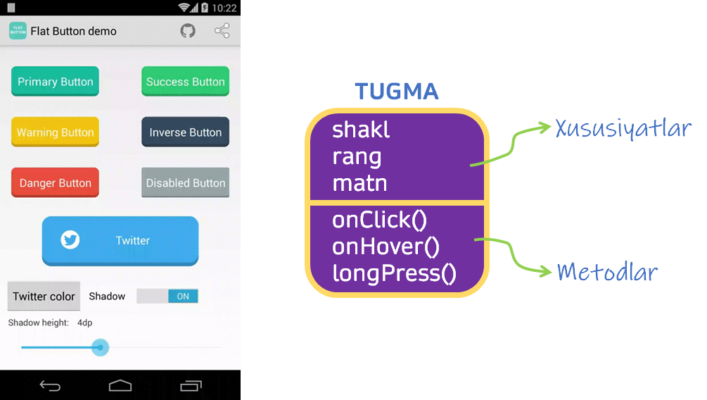 Agar real dasturdan misol keltiradigan bo’lsak, istalgan dastur ichidagi tugma bu obyekt. Uning shakli, rangi va matni esa xususiyatlari bo’ladi. Tugma ustida bajariladigan amallar tugmaning metodlari deyiladi. Misol uchun tugmani bosish, uzoq bosish, ustiga sichqonchani olib borish va hokazo.