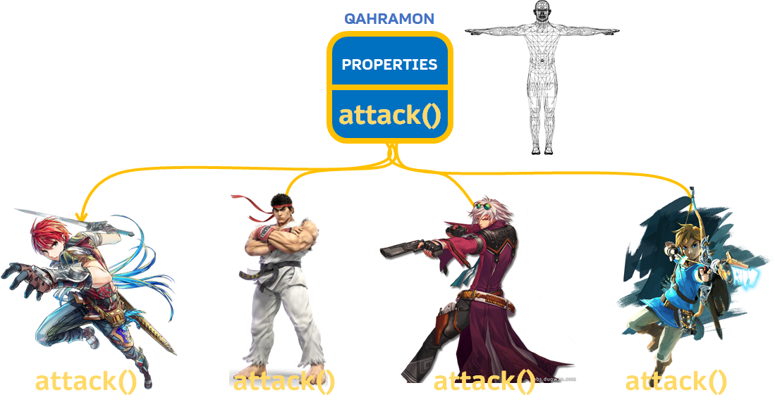 Qahramon bir nechta xususiyatlarga va metodlarga ega. Jumladan attack() ya’ni xujum qilish metodi, qahramonni xujum qilishga undaydi.
