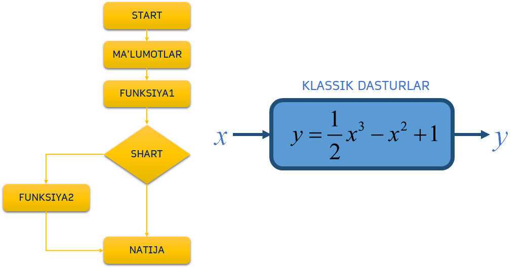 OOPni tushunish uchun avval klassik dasturlashni ko’raylik. Gap shundaki ilk kompyuterlar va dasturlar matematik muammolarni hal qilishga qaratilgan. Bunday dasturlar foydalanuvchidan biror ma’lumotlarni qabul qilib olgan, va qati’iy ketma-ketlik ya’ni tartibga amal qilgan holda turli arifmetik amallarni bajarib, dastur so’ngida foydalanuvchi kutgan natijani qaytargan. Shuning uchun ham bunday dasturlar chiziqli yoki tartibli dasturlar deb ataladi.