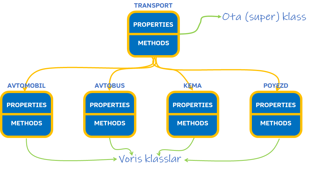 Dasturlash jarayonida biz bir klassdan boshqa klasslar yaratishimiz mumkin. Misol uchun bizda transport klassi bor, biz bu klassdan qo’shimcha Avtomobil, avtobus, kema, poyezd kabi klasslarni yaratishimiz mumkin. Bunda bizning asl klassimiz ota yoki super klass deb ataladi, undan yaratilgan klasslar esa voris klasslar deyiladi.