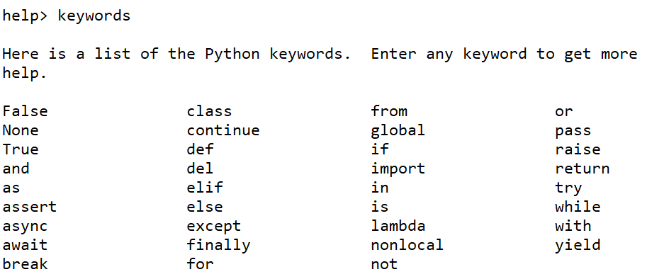 help()deb yozing va Enter tugmasini bosing. Keyin esakeywordsdeb kiritib, yana Enter bosing. Marhamat, ekraningizda Pythondagi maxsus kalit so'zlar ro'yhatini ko'ryapsiz: