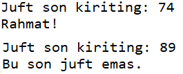 - Foydalanuvchidan juft son kiritishni so'rang. Agar foydalanuvchi juft son kiritsa "Rahmat!", agar toq son kiritsa "Bu son juft emas" degan xabarni chiqaring.