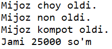narh = 15000 # mijoz 15 so'mga ovqat oldi