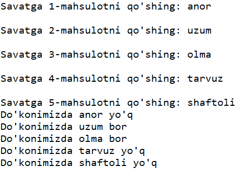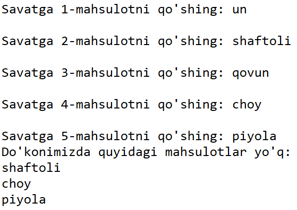 - Yuqoridagi dasturni quyidagicha o'zgartiring: foydalanuvchidan 5 ta mahsulot kiritishni so'rang. Foydalanuvchi so'ragan va do'konda bor mahsulotlarni yang,