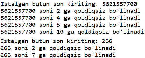 - Foydalanuvchidan biror butun son kiritishni so'rang. Foydalanuvchi kiritgan sonni 2 da 10 gacha bo'lgan sonlardan qay biriga qoldiqsiz bo'linishini konsolga chiqaring.