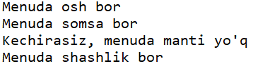 'osh' in menu # menu da osh bormi?