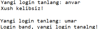 foydalanuvchilardegan ro'yxat tuzing, va kamida 5 ta login qo'shing. Foydalanuvchidan yangi login tanlashni so'rang va foydalanuvchi kiritgan loginni foydalanuvchilar degan ro'yxatning tarkibi bilan solishtiring. Agar ro'yxatda bunday login mavjud bo'lsa, "Login band, yangi login tanlang!" aks holda "Xush kelibsiz, foydalanuvchi!" xabarini chiqaring.