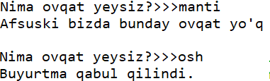 ovqat = input('Nima ovqat yeysiz?>>>')
