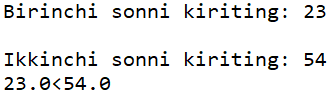 - Foydalanuvchidan ikita son kiritishni so'rang, sonlarni solishtiring va ularning teng yoki katta/kichikligi haqida xabarni chiqaring