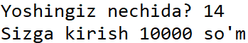 - Agar foydalanuvchi 18 dan kichik bo'lsa 10000 so'm