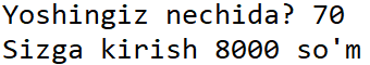 elif yosh<65: # 12 dan katta va 65 dan kichiklarga narh 10000 so'm