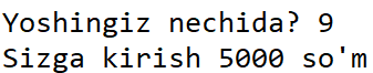 elif yosh<=12: # 4 dan 12 yoshgacha 5000 so'm